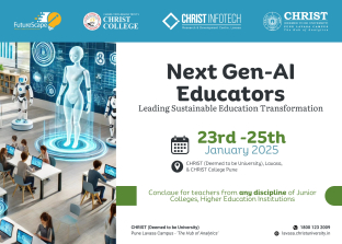 A conclave for teachers from any discipline of Junior Colleges, and Higher Education Institutions, conducted by Christ Deemed-to-be University, Lavasa in collaboration with Christ Infotech and Christ College, Pune. Its goal is to deliver Expert Talks and Workshops by Industry Professionals, Academic Scholars, Panel Discussions, Poster presentations, and the Best SDG Campus competition.